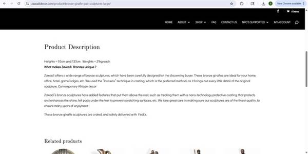 We have owned these lovely creatures for 20 years, purchased from a local antique dealer. They are only sold from one place new, a metal artistry shop in South Africa, photos of the website below. You can go to zawadidecor.com to look for yourself. The giraffes are in excellent condition and a joy to see every morning. Times are hard and we must let them go to a new home. No scams or unreasonable offers will be answered. Local pickup only.