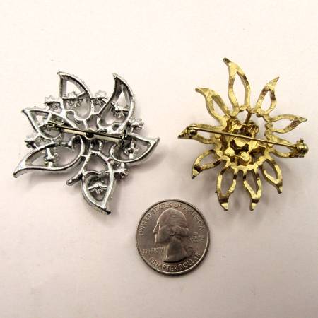 Two vintage 1960’s brooches. The silver brooch has one missing crystal stone. Please examine the photos to confirm item details and to assess the conditions yourself. Feel free to message me if you have any questions or comments. Also be sure and check out the other items I have for sale. Thank You.