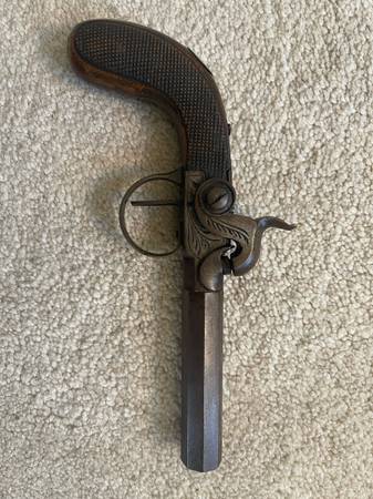 I have an original antique LIEGE BELGIAN PERCUSSION BOOT derringer with screw barrel from circa 1850s for sale. It’s a pocket size, in 45 caliber, uses black powder and in great cosmetic and functional condition. It’s just a cash sale as an antique, no need of registration or paperwork. It’s not easily available but I see it was sold around $400 to $500 in auctions. I am also open for trade in with other black powders.
