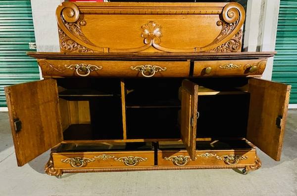 Gorgeous antique sideboard with carved fruit centerpiece, decorative brass accents, and scrolled backboard. Solid wood construction, very heavy. Perfect statement piece for dining room or...