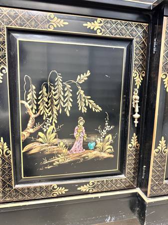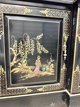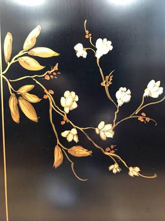 black lacquered finish, with hand-painted Chinoiserie motifs featuring scenes, birds, and flowers.