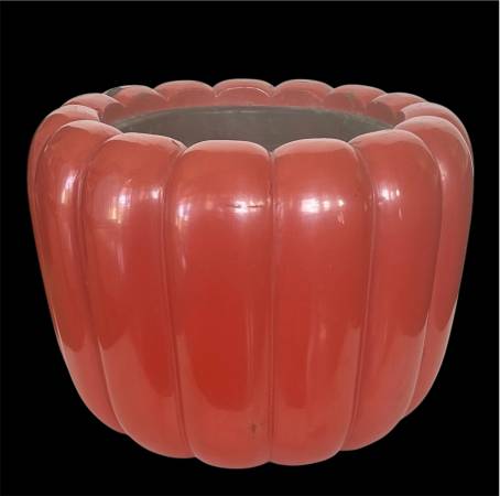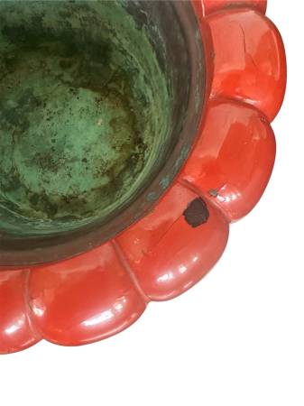 The is a Japanese Chrysanthemum Hibachi, specifically a Negoro Lacquer type from the early 20th century. It is a bowl or planter, featuring a distinctive chrysanthemum shape and a red lacquer finish.