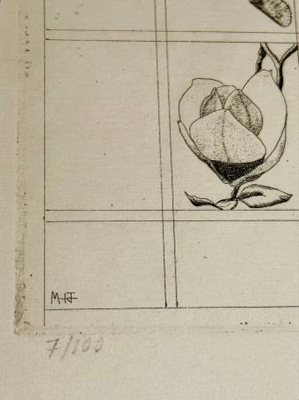A Limited edition etching displays a grid-based etching featuring natural elements if shells, snail, leaves and flowers, with a delicate, scrupulously rendered details.