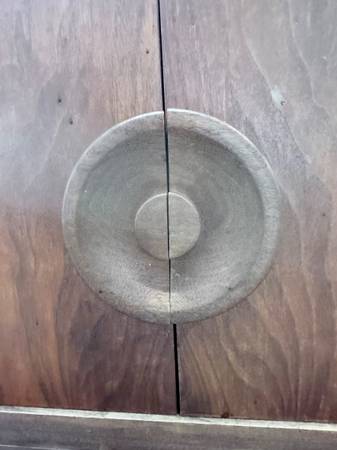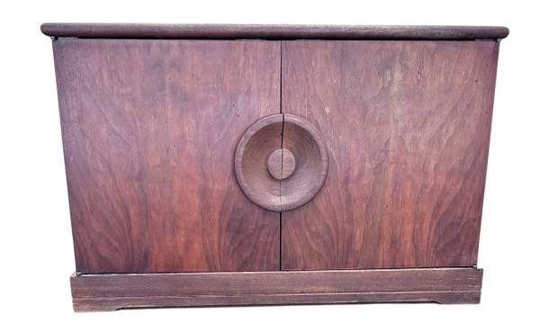 Design Details: Features prominent, hand-carved circular door pulls, adding a sculptural element to the piece.
