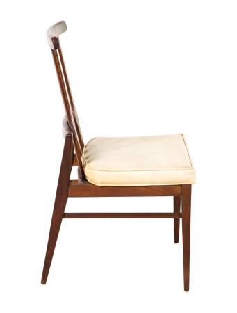 With playful geometric patterns carved from the walnut backrests that scream "1960's" and featuring newly upholstered leather cushion in a fabulous white, this Atomic-era lounge chair is truly unlike any other. Building only limited numbers of pieces, usually no more than 500-700 for any particular model, the beauty of this Foster McDavid chair is matched only by their rarity.