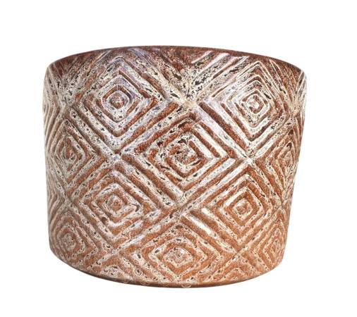 This contemporary glazed ceramic planter features an intricately embossed design.