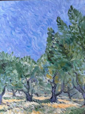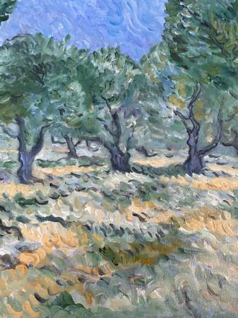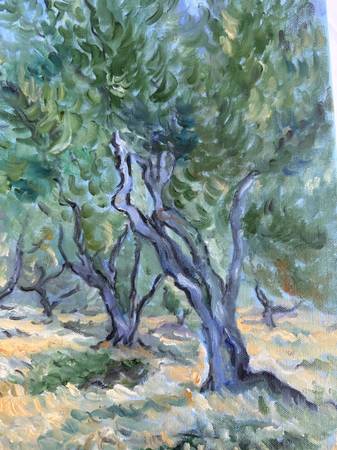 Plein Air Post Impressionism Landscape Olive Trees Signed Painting In the style of olive trees by Van Gogh. The artist here draws on colour contrasts rather than the effects of natural light. Oil on...