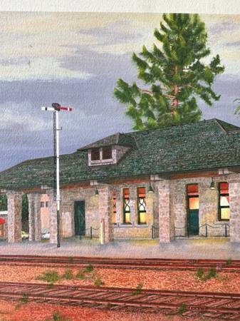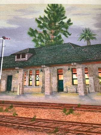A wonderful, colorful painting captures a quiet dusk evening at the Santa Rosa, California train station.