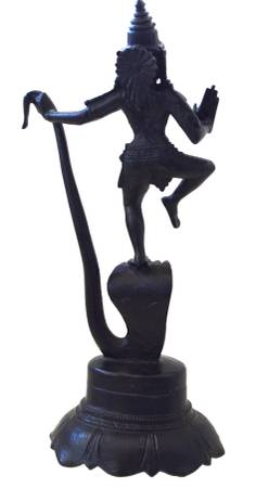This statue depicts the story of Krishna's encounter with the multi-headed serpent-demon Kaliya. According to myth, Krishna was raised in the countryside by gopis (females who tended the cows). When he was a youth, Kaliya lived in a whirlpool in the sacred river Yamuna, terrifying the population and spreading his poison throughout the land.