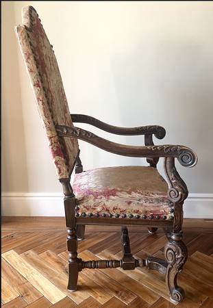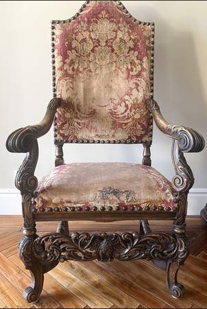 Beautiful antique Italian carved wood side chair. It has an upholstered seat and back in red and gold brocade fabric that is quite worn due to age. The chair measure 26" wide at the front, 20" wide at the back, 20" deep and 49" tall. It is sturdy and well made.