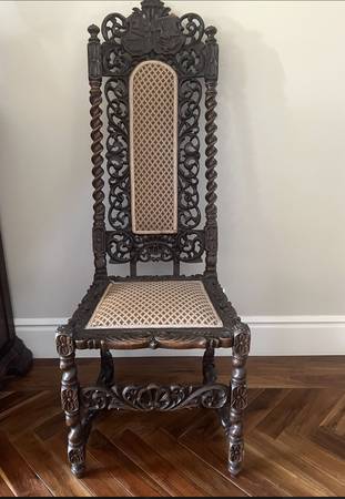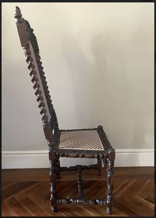 Antique Italian ornately carved wood side chair with upholstered seat and back. The fabric is cream and gold velvet. It measures 20" wide at the front, 17" wide at the back, 17.5" deep and 54" tall. It is in very good condition and is sturdy and well made.