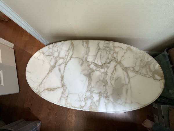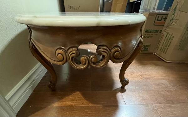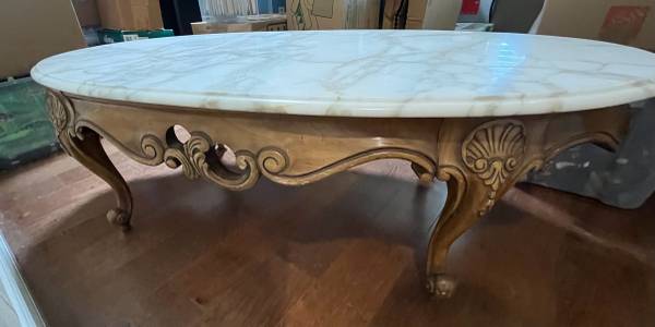 Carved wood and Carrera marble coffee table, oval shaped. Vintage Italian Provincial. 1950s-1960s.