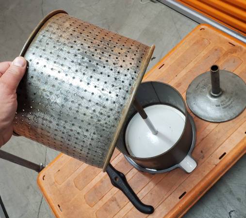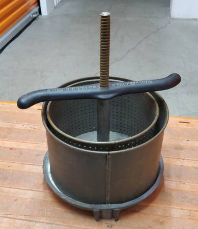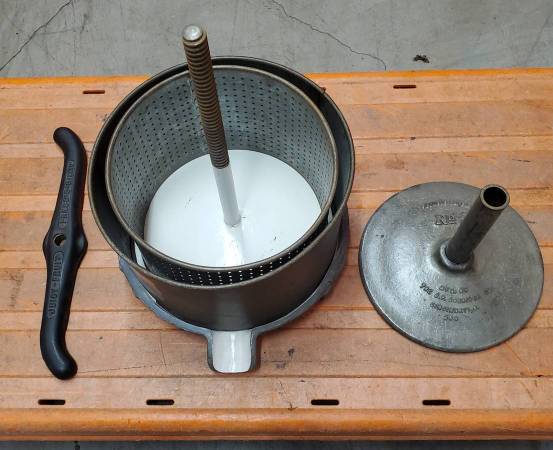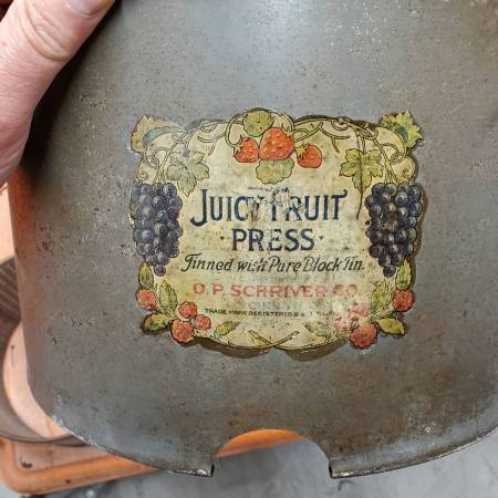 Antique Juicey Fruit Press Juicer Large size manual screw drive press. Cast iron and tinned steel. O. C. Schriver Co., Model 1.