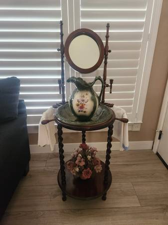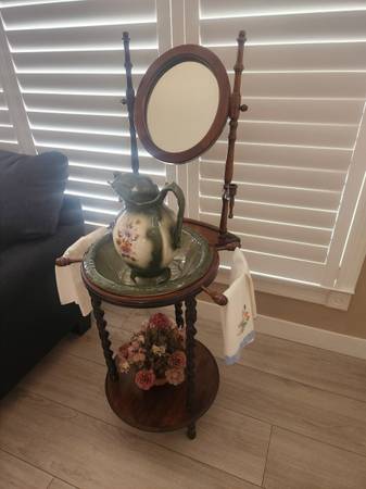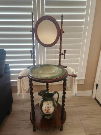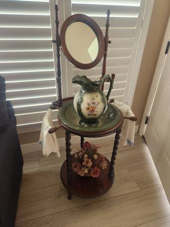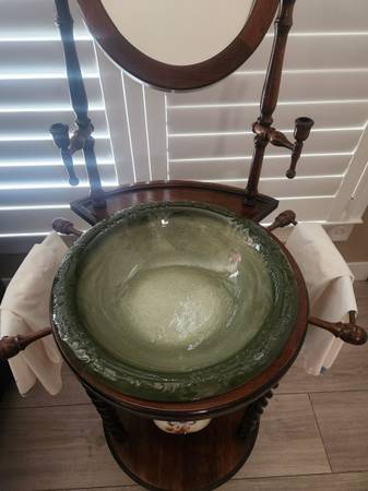Beautiful antique victorian style wash basin on stand with mirror. Matching green pitcher and wash basin. Excellent condition! Candle holders are adjustable and can slide outward.