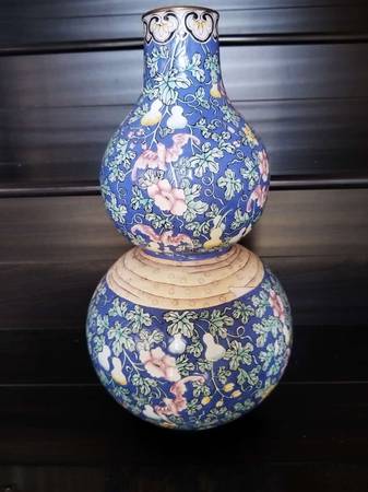 清嘉慶蝙蝠瓜迭綿綿銅胎畫琺瑯包袱束腰葫蘆瓶 Very beautiful Imperil Qing Jiaqing period enameled gourd, made of solid copper, gilt mouth and foot rim, about 13" (32 cm) tall, in good condition. Price firm, cash only.