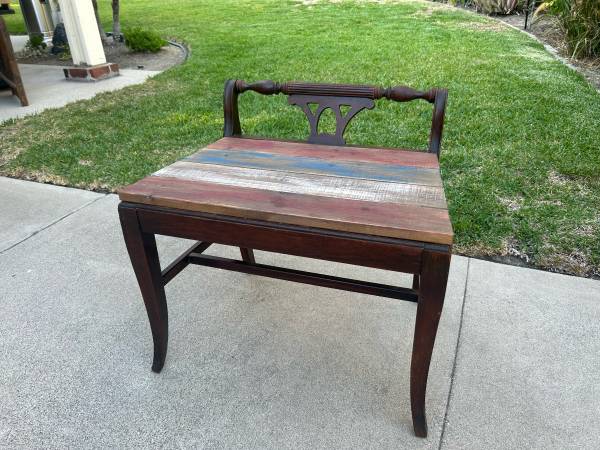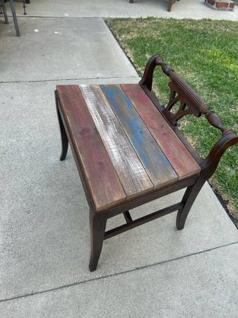 The seat has been replaced with an Americana style reclaimed wood top. Great kid bench, plant holder. Porch seat.