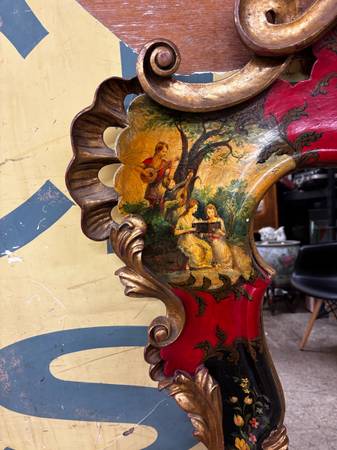 5 foot tall antique Mirror Venetian-style painted and gilt mirror. Rococo or Baroque Revival, features extensive hand-painted details and gold leaf gilted wood frame. 5'1" tall and 40" wide