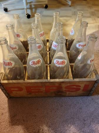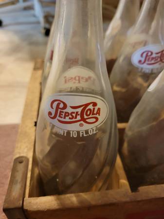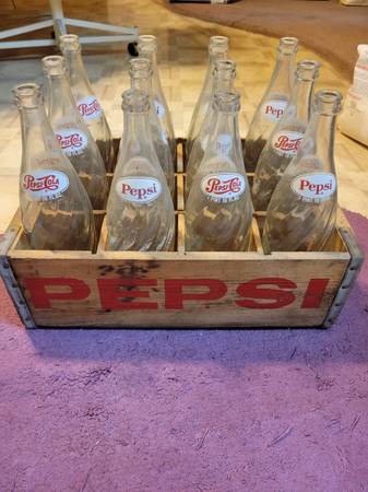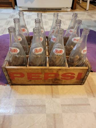 12 antique vintage Pepsi Cola glass bottles with wooden crate. 1 pint 10 oz. Clear bottles. Everything for $40.00 cash