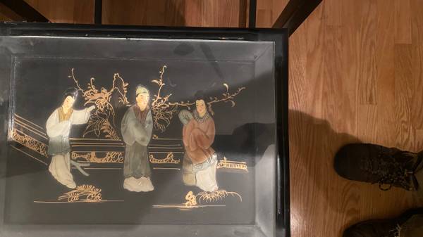 Chinoiserie Black Lacquer Secretary Desk, Cabinet, & Nesting Table All pieces are in good condition. the graphics are on laid stone.