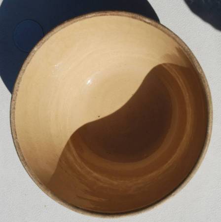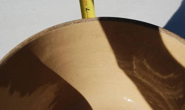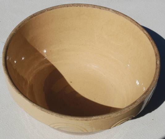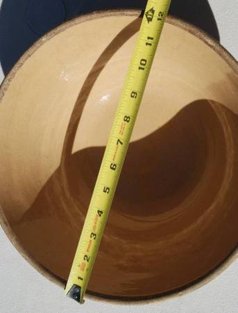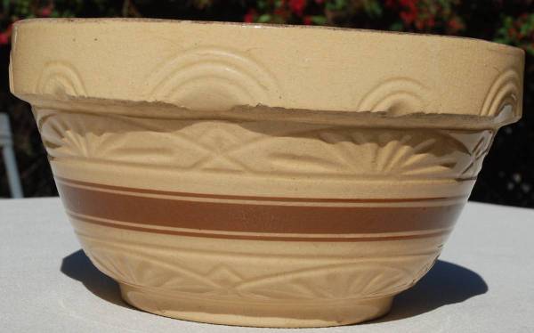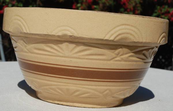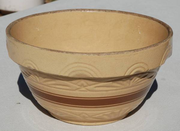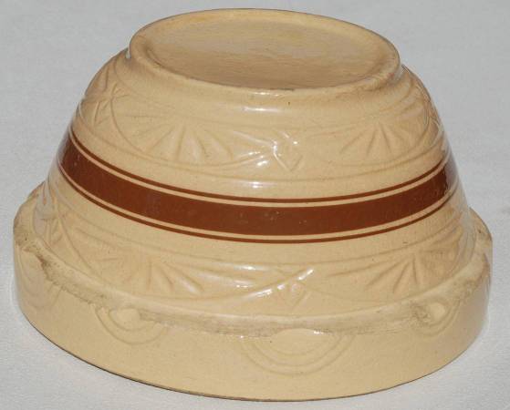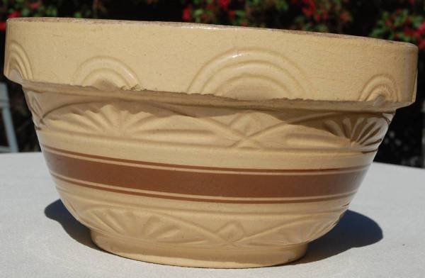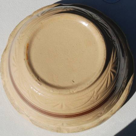 This is a 1930’s 12” RRP yellow ware kitchen bowl made in Roseville, Ohio. It is a large bowl with indents on the shoulder and a half circle design. It also has three brown stripes that go around the bowl. There are other recognizable designs in the bowl itself. It sits on a raised base. The bowl measures 12”W x 6.5” H. It has no chips or cracks. There are some pottery imperfections though.