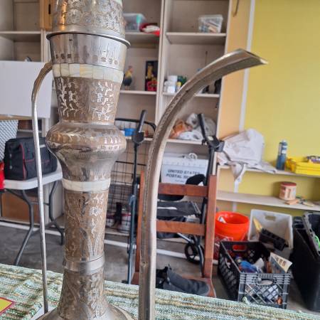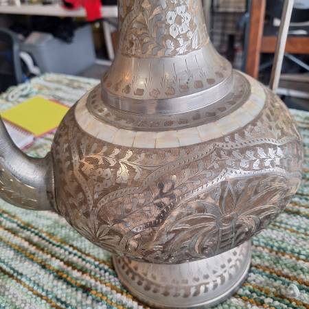 Middle Eastern teapot with extensive ornamental work including 4 layers of mother of pearl inlays thru out this brass body. Hard to find in this size and quality. Asking 40.00 Poor best offer, no...