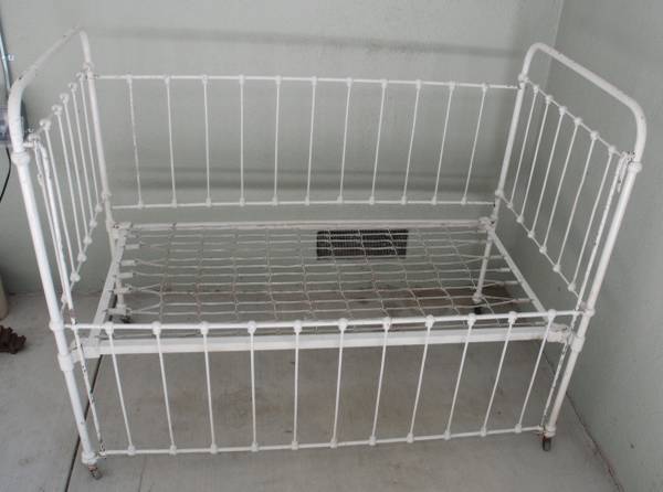 This Victorian Shabby chic look. It is in a BALL and STICK style. The bed is easily dismantled into four parts. The crib has its original wooden wheels. The crib can be used for a doll or bear collection, measures 54" length x 29" wide" x 42" tall "; and weighs approx. 80 lbs.