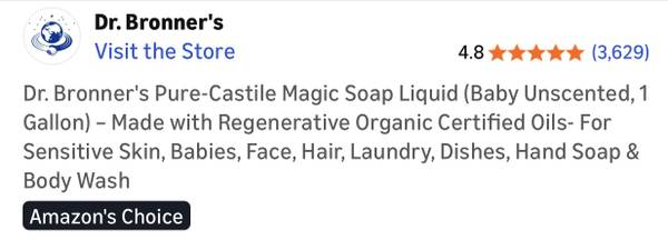 Dr. Bronner‘s Pure Castile Magic Soap Liquid (baby scent) 1 GALLON size. Made with regenerative organic certified oils for sensitive skin, babies, face, hair, laundry, dishes, hand soap, and body wash.