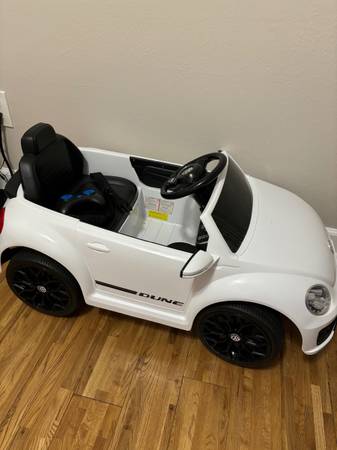 Toddler beetle dune 12v white VW style single seater Always stored inside guest room. Charged once and driven once. Daughter was too timid to drive it and never used it. Comes with remote control.