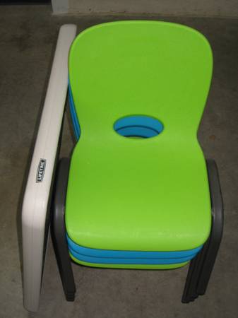 4 stacking children chairs and folding table. Lifetime brand. Like new, no dings. Chairs are "heavy duty" to last. Super compact for storage out of the way. $138 or more for new.
