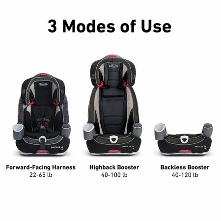 Graco's top-rated Nautilus 65 3-in-1 harness booster can be used from toddler to youth, keeping your growing child safe. It secures your child in a 5-point harness from 22-65 lb, converts to a belt-positioning booster from 30-100 lb, and becomes a backless booster seat from 40-100 lb. Its Simply Safe™ Adjust harness allows you to adjust the harness and headrest together as your child grows, with no time-consuming rethreading. You'll appreciate the strength of the steel-reinforced frame, 3-position recline for comfort and fit while your little passenger enjoys a personal cup holder and storage compartment.