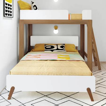 This mid-century-L shaped bunk bed, a twin loft bed on top and a queen-size sleeper bed on bottom w guard rails, color brown and white. Space-saving, modern bed: Solid wood bunk bed opens up floor space by stacking two sleeping surfaces or bunk bed can be separated into a twin high loft bed and a queen-size single bed.