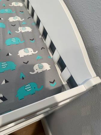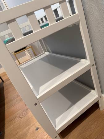 White, multiple shelf’s with changing pad. Beautiful space saving table. I believe I paid about $150 for this 18 months ago.