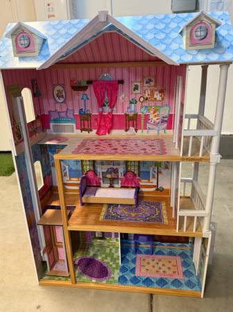 Kidkraft large doll house Great for pretend play Only 2-3 accessories are there. Measurements are : 48”tall, 32” length, 13” wide Good condition