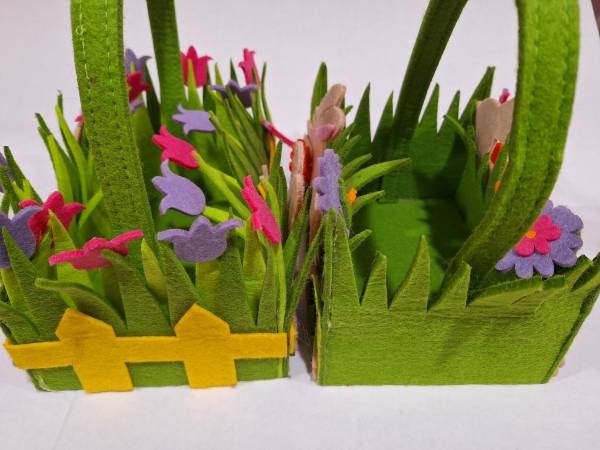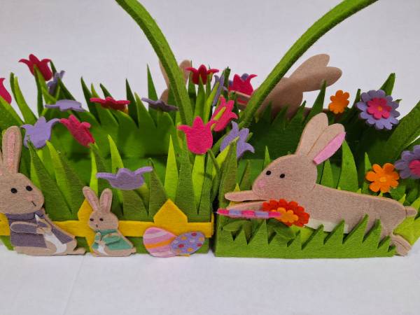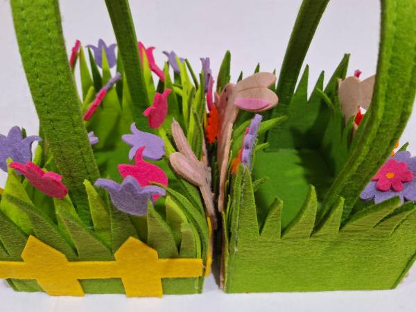 Charming and whimsical basket made of soft felt material with enchanting garden themed design. Perfect for decorating with a touch of nature-inspired charm.