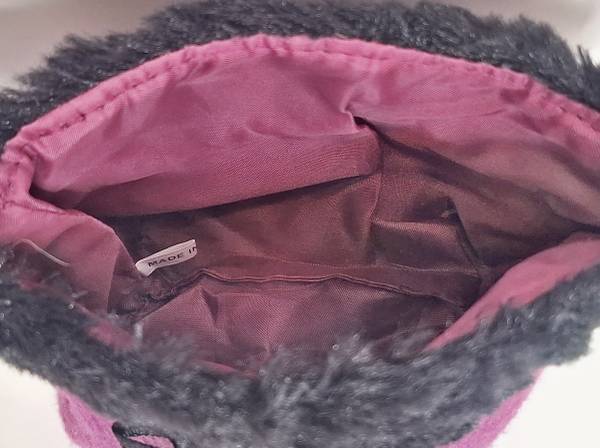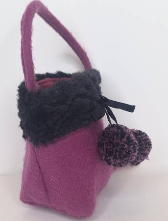 This petite magenta felt handbag features black faux fur trim along the top edge and decorative pom-poms dangling from the front. The handle is also magenta felt and the interior is lined in matching magenta. It is big enough to carry a few other must-haves!