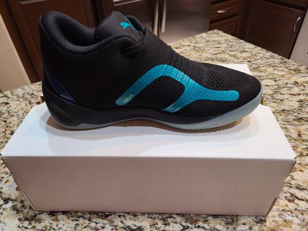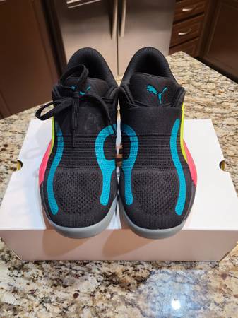 Gently used Puma Rise Nitro Basketball shoes, Black Sunset Glow color model, men's size 8.5. Used indoors only a few times by my son.