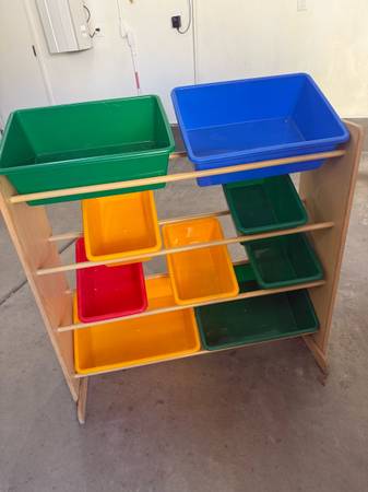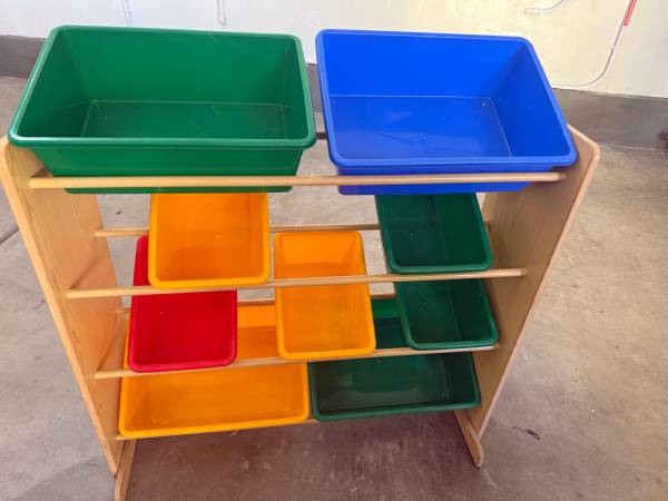 Wooden Storage unit with bins Total 10 bins Great for storage Excellent condition Great for storage toys and other stuff For indoors Measurement : 35” length ,13”Wide ,31”tall