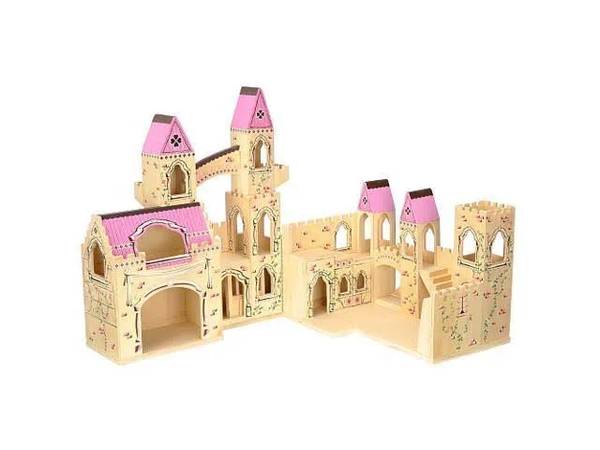 Melissa & Doug Deluxe Folding Medieval Wooden Castle and Princess Wooden Castle with dungeon and a working drawbridge, castles feature towers, balconies, a trap door, an arched walkway. Castles hinged for easy wide open.