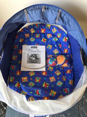 Bounceable dome keeps baby entertained and protected indoors or outdoors. A cozy and convenient play space, with two canopies one of which is mesh, travels anywhere you take your baby. This item comes with a toy gym that hangs inside the dome and has three removable toys. Folds compactly for easy portability. Pad removes for machine washing.