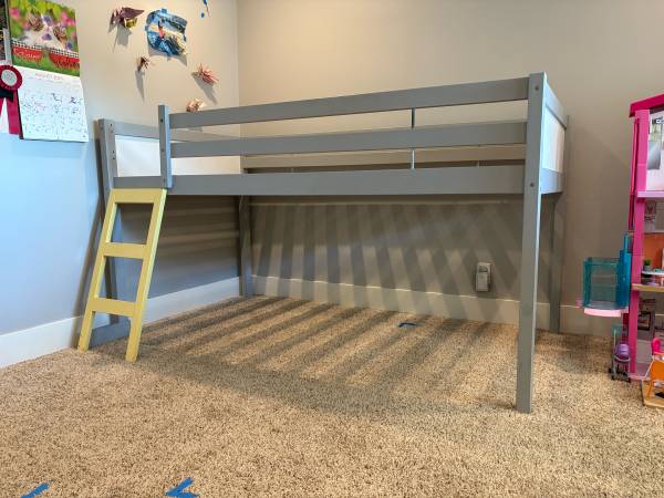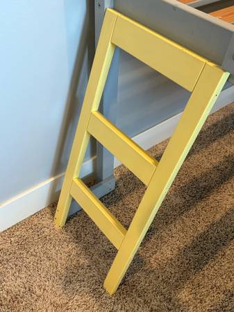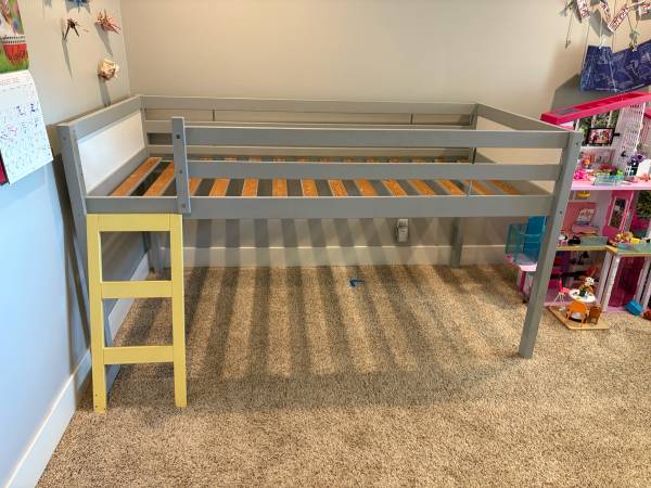 This raised bed is the perfect height to allow for storage or playtime underneath and it is in great shape. Color: gray bed with yellow ladder.