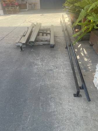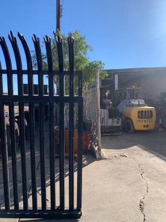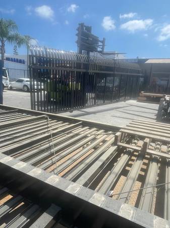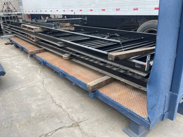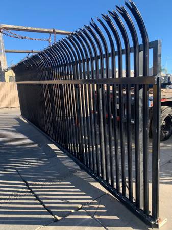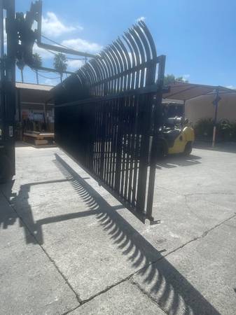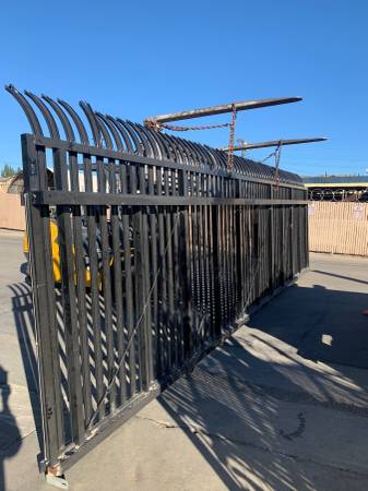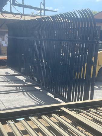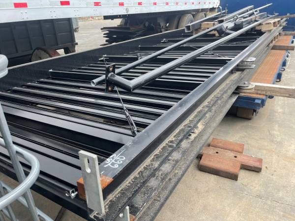 SLADING GATES OUT OF ALUMINUM (2 SECTIONS) WITH A TOTAL WEIGTH EACH OF 660 LBS AND COMBINE 1320 LBS PLUS THE EXTRA PARTS, RAILS ETC. THE MEASSURMENTS ARE 2 FRAME S @ 77” AND HIGHEST POINT 91” SPIKES...