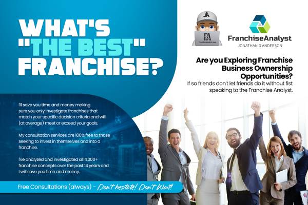 I’m an independent Franchise Analyst and a Franchise Consultant. I use my 14 years behind the scenes from inside franchising to help match clients with the right franchise. I save people time and money. My franchise consultation services are of no cost to my clients. You have no obligation to buy. I’d love to connect with you. Feel free to click this link and pick a day and time for us to have a call. https://calendly.com/jonathan-anderson