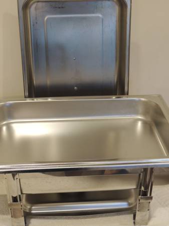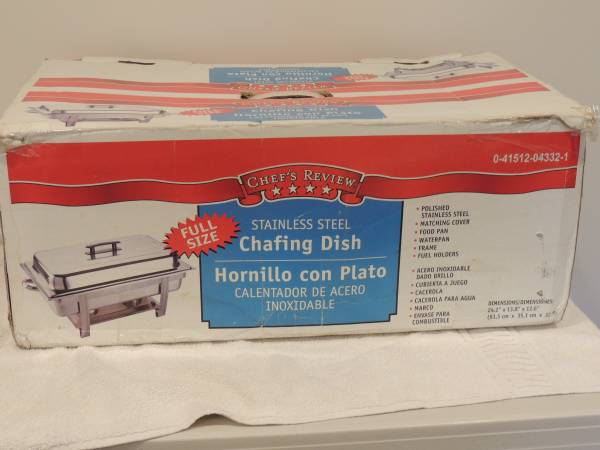 Stainless steel chafing dish (Chef's Review brand). In it's original box. Excellent condition. Contains food and water pan, frame and lid. **One fuel holder only.
