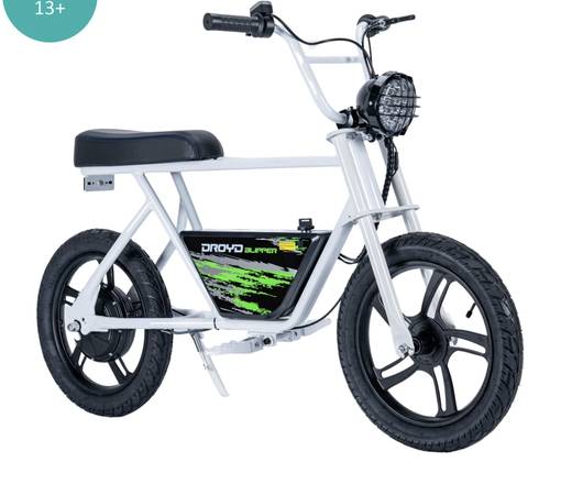 • The Droyd Blipper is a fun and safe electric bike for ages 13 and up that's ready to take your growing rider on all sorts of adventures. Simple to set up and ride, the Blipper is packed with an easy-to-use accelerator that goes up to 12.5 mph and a long-lasting 24V battery with a max run time of 60 minutes. With safety as the top priority, the pneumatic rubber tires and UL2272 certification provide parents with peace of mind and riders with a safe yet thrilling experience.