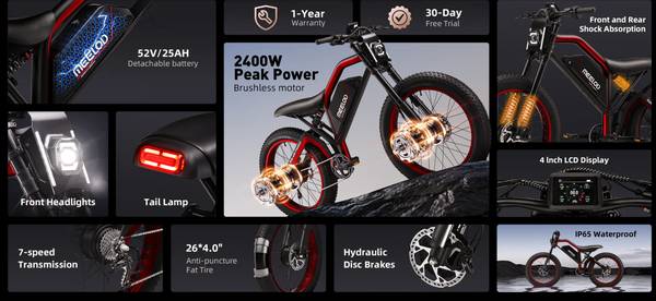 The MEELOD XT600DL 26" Retro Moped Style Electric Bike is the perfect blend of vintage style and modern power. Crafted with a robust 6061 aluminum alloy frame, this electric bike offers exceptional durability and strength for riders who demand both performance and reliability. Equipped with dual 750W motors delivering a peak power of 1200W each, the XT600DL accelerates smoothly to a top speed of 35 mph, ideal for city streets or rugged trails.