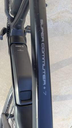The Trek Super Commuter+ 7 is a high-performance electric hybrid bike designed for city commuting, featuring a hydroformed aluminum frame with an integrated battery, a powerful Bosch motor, and a 10-speed Shimano drivetrain. Key specifications include a maximum weight limit of 300 lbs (136 kg), a 27.5-inch wheel size with 2.4-inch Schwalbe tires, hydraulic disc brakes, and integrated front and rear lights. It provides pedal assistance up to approximately 20 mph and comes with accessories like a rear carrier and kickstand. Please note that it has a Cane Creek Thudbuster seat post that costs $200.