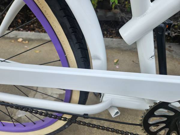 White with purple skull 26" 3-speed cruiser bicycle. Needs new back tire and has a dent on one of the wheel covers but otherwise in beautiful condition.