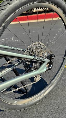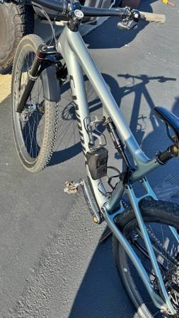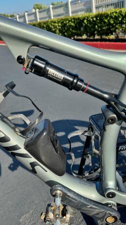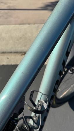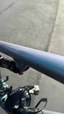 Few rock chips (see photos). I am the second owner. Original owner built (11k) the bike and raced it a few times then sold it to me. I put new tires, brakes and front shock on per my ride preferences.