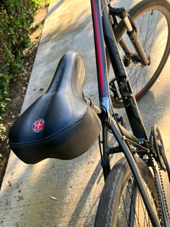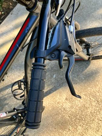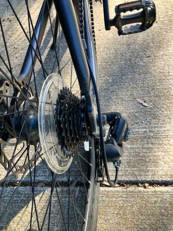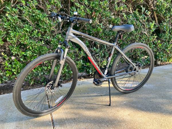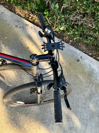 Schwinn hybrid bike in excellent condition. The frame is medium to large and aluminum. The tires are 700c (29”). It’s equipped with 3x7 speed Shimano drivetrain and mechanical disc brakes. It has a front suspension for smooth rides. Brakes and gears work smoothly. The seat is comfortable. It has phone holder, water bottle holder, bell, kickstand and passive front/rear reflectors. It’s ready to ride.