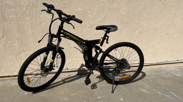 This is an All-Terrain Folding bike so you put it in trunk of car or small areas. it has Shimano 21 gear system and brake disk, it is electric and manual in case battery runs out. It has a 350W motor with full dual suspension. I bought it about 1 year ago and only used it twice around where I live. I have lower back pain and stopped using it.